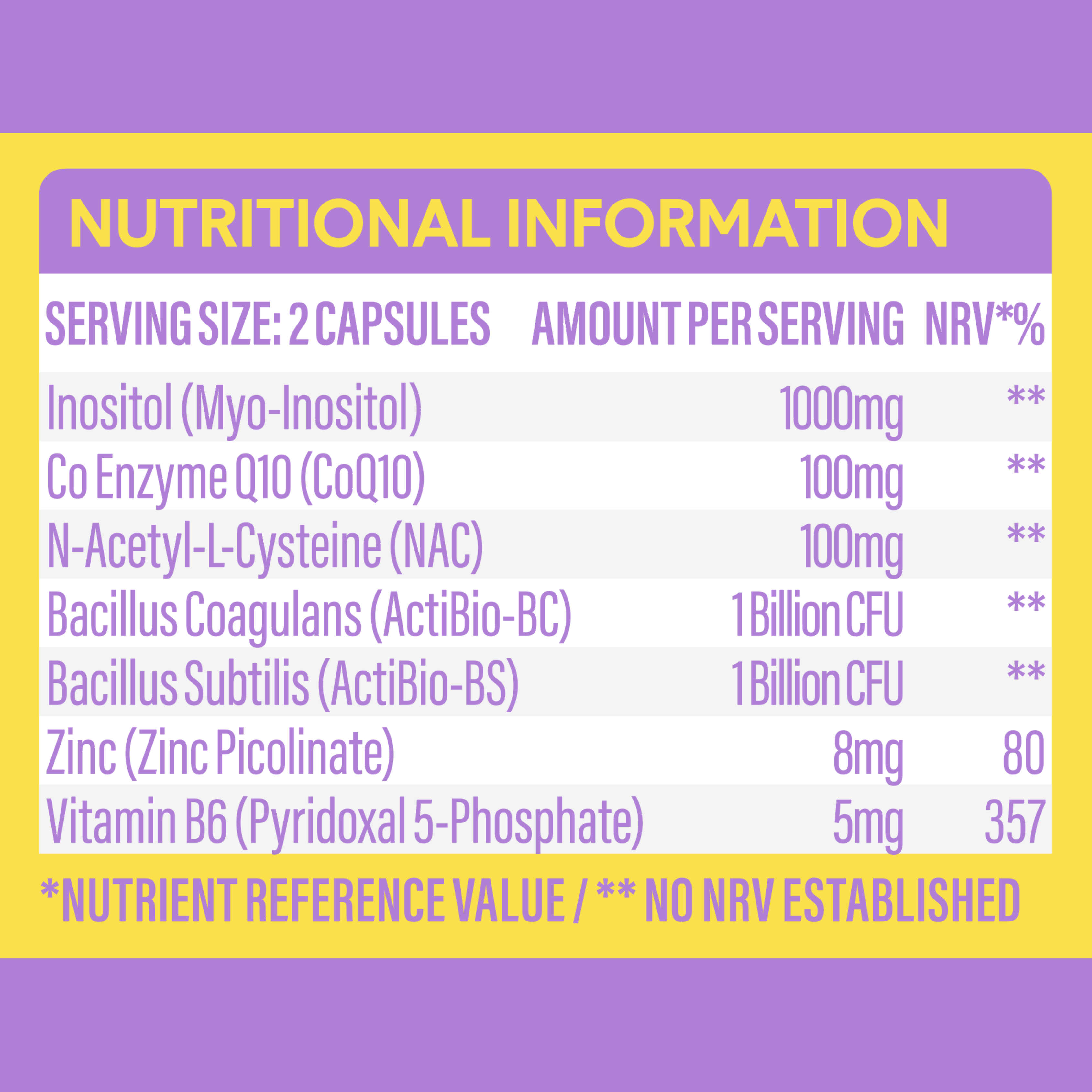Myo-Inositol 1000mg, Coenzyme Q10 (Ubiquinone) 100mg, N-acetyl-L-Cysteine 100mg, Pyridoxal 5-Phosphate (B6) 5mg, Zinc Picolinate 8mg, Bacillus Coagulans 1 Billion CFU, Bacillus Subtilis 1 Billion CFU.